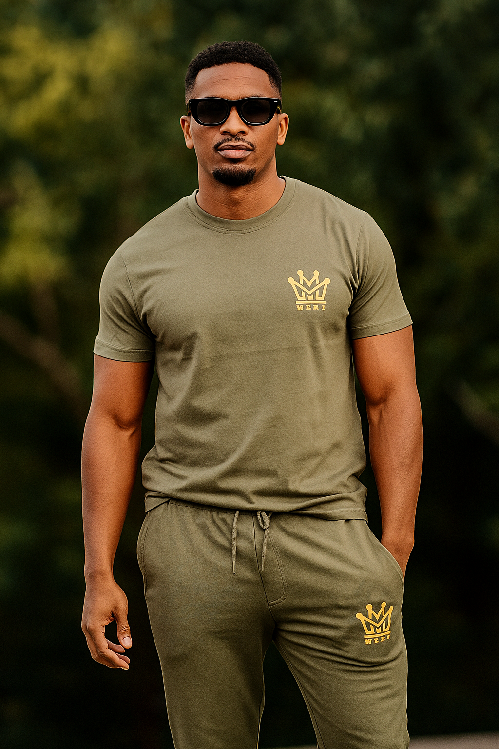 The MEER Crown Tracksuit Set in olive green combines premium comfort with sophisticated style. Made from a buttery-soft cotton blend, it offers breathable, lightweight, and flexible wear suitable for all seasons. The matching gold crown emblems on the chest and thigh create a coordinated, luxurious look. The athletic tee features a ribbed crew neck that retains its shape after washing, while the joggers include deep side pockets and an adjustable draw cord waist for a tapered yet roomy fit. Perfect for lounging, running errands, or stylish travel.